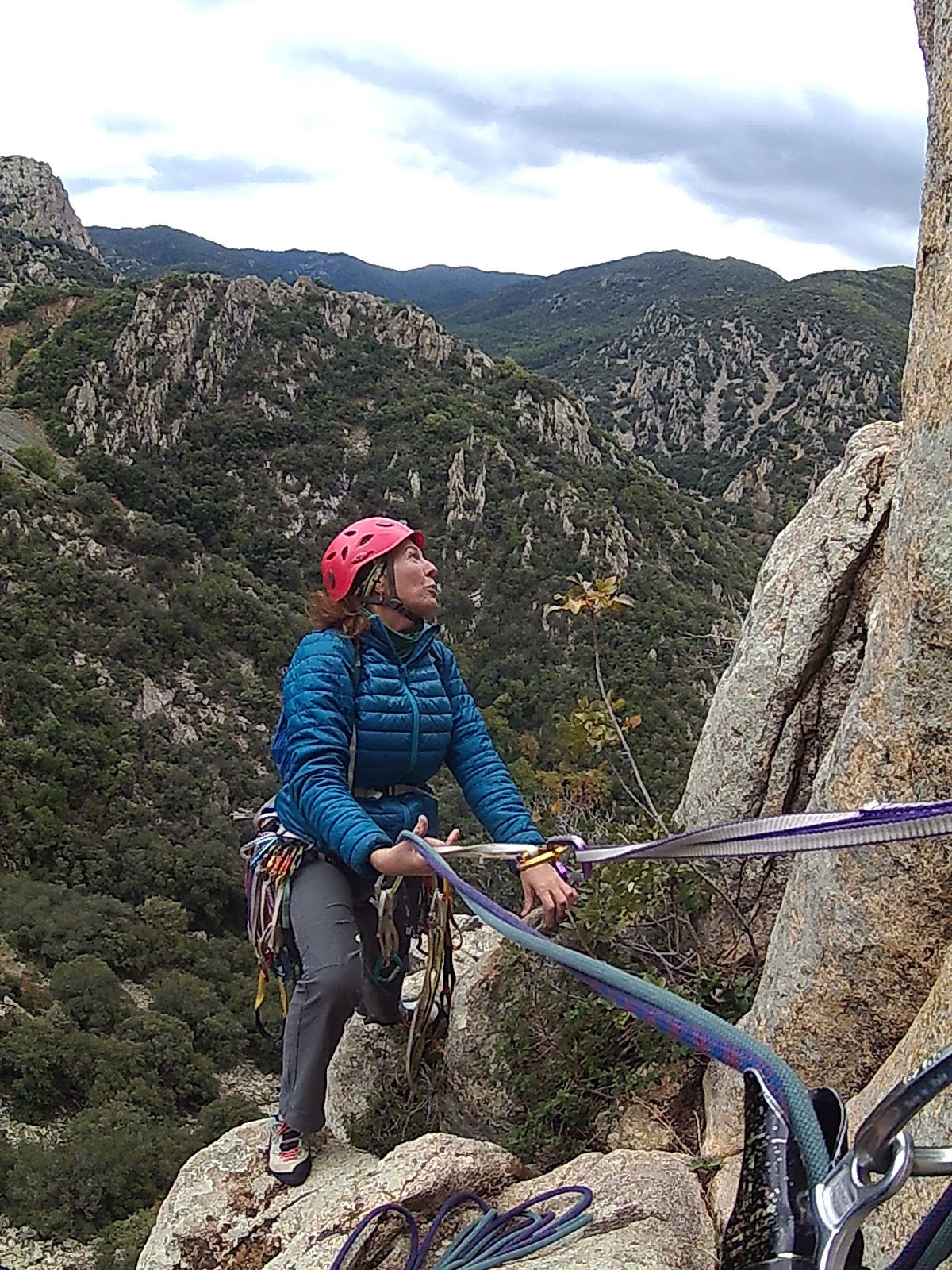 Mentre anem escalant ens anem creuant pitons antics. Nosaltres en el primer llarg agafem una primera reunió de la via veïna.